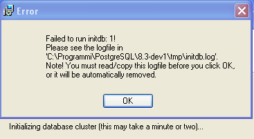 initdb: removing data directory "C:/Programmi/PostgreSQL/8.3-dev1/data"