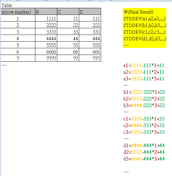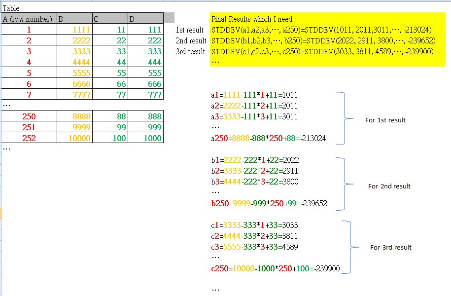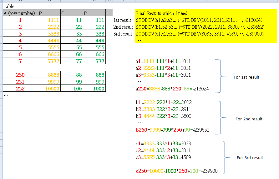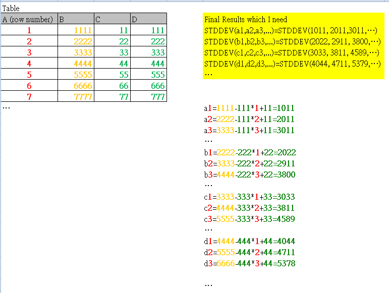 are STDDEV(a1,a2,a3,...), STDDEV(b1,b2,b3,...), ..etc. Idefinitely know