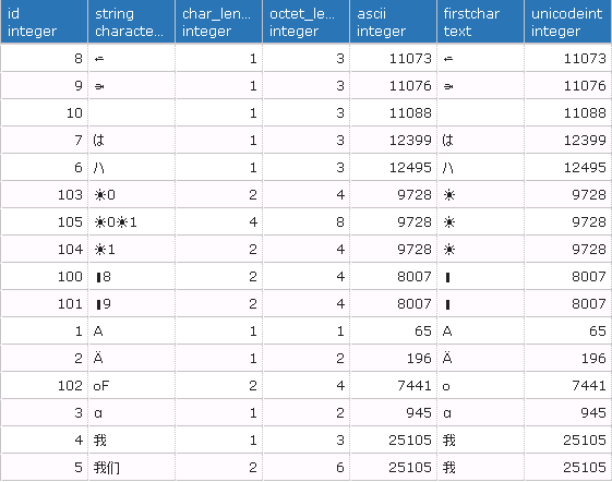 insert into unicode(id, string) values(6, U&'\30CF'); -- a Japanese