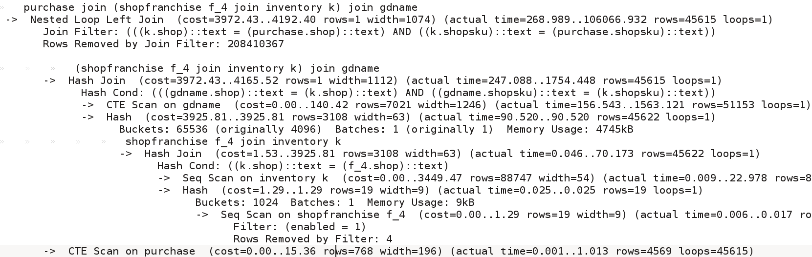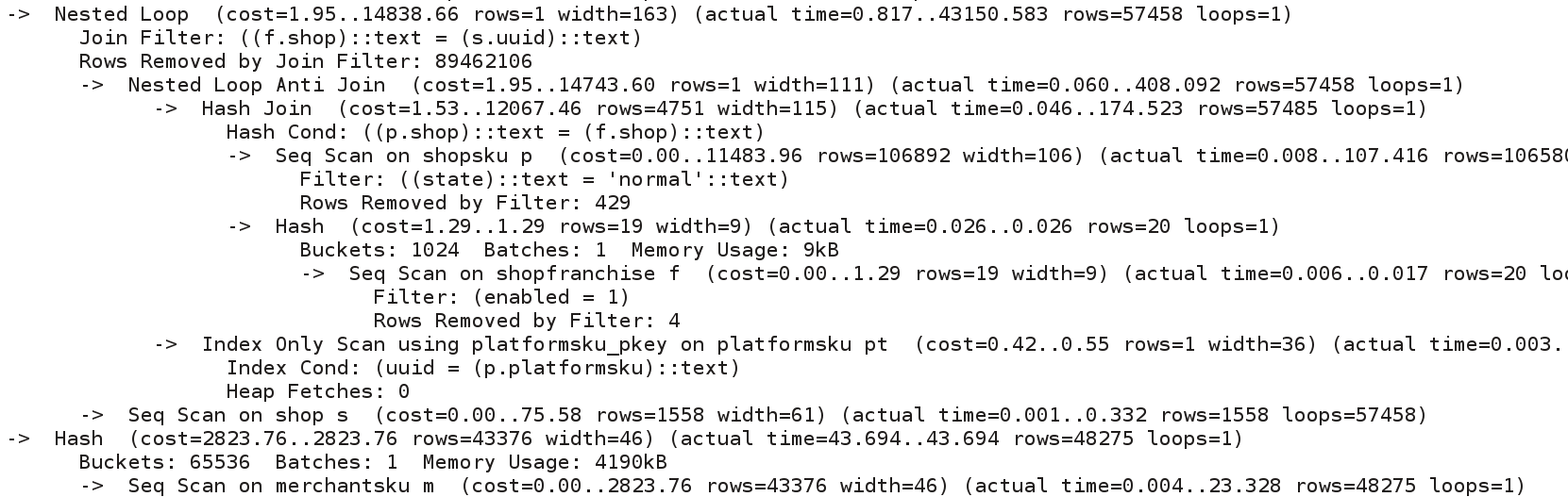 while in analyze explain,it actually returns 57458 row.so higher level nest loop would get 57458*1558 rows,this cause this query runs for more than 40 seconds.