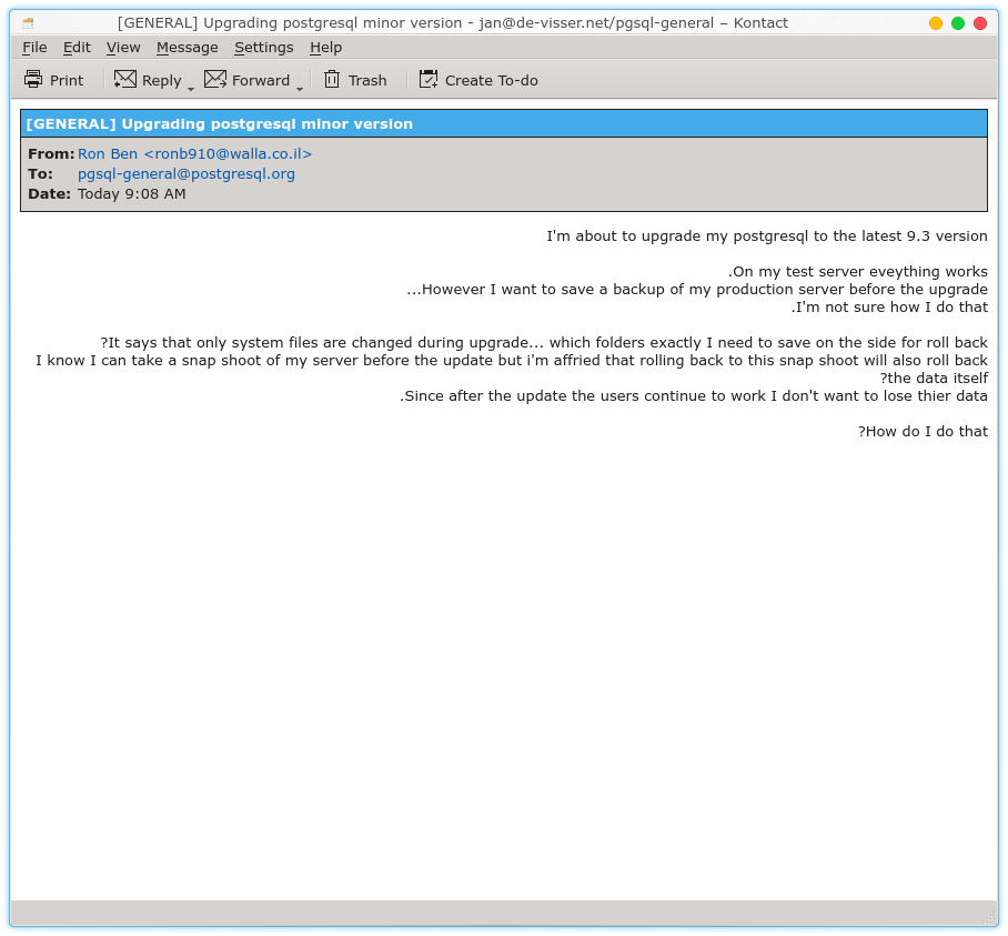 </div></div><section class="cust_msg_end"></section><blockquote style="margin:0;margin-bottom:20px;border-top:1px solid #e0e0e0;"><br>ב מאי 10, 2017 16:27, Adrian Klaver כתב:<blockquote style="margin:0;margin-bottom:20px;border-top:1px solid #e0e0e0">On 05/10/2017 06:08 AM, Ron Ben wrote:<br>> I'm about to upgrade my postgresql to the latest 9.3 version<br>> On my test server eveything works.<br>> However I want to save a backup of my production server before the <br>> upgrade...<br>> I'm not sure how I do that.<br><br><a href="https://www.postgresql.org/docs/9.3/static/app-pg-dumpall.html">https://www.postgresql.org/docs/9.3/static/app-pg-dumpall.html</a><br><br>&gt; It says that only system files are changed during upgrade... which <br>> folders exactly I need to save on the side for roll back?<br><br>I would say that would depend on the nature of the release changes.<br><br>> I know I can take a snap shoot of my server before the update but i'm <br>> affried that rolling back to this snap shoot will also roll back the <br>> data itself?<br>> Since after the update the users continue to work I don't want to lose <br>> thier data.<br><br>Well if the upgrade takes then you don't need to rollback. If it did not <br>then the users did not get any work done or any data they entered would <br>be considered suspect. If you are concerned then take another pg_dumpall <br>before rolling back.<br><br><br>> How do I do that?<br><br><br>-- <br>Adrian Klaver<br>adrian.klaver@aklaver.com<br><br><br>-- <br>Sent via pgsql-general mailing list (pgsql-general@postgresql.org)<br>To make changes to your subscription:<br><a href="http://www.postgresql.org/mailpref/pgsql-general">http://www.postgresql.org/mailpref/pgsql-general</a><br><br><br></blockquote></blockquote><br></div>