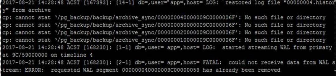 However, when I tried to start the new slave, I am getting the error that it cannot locate the archive wal files and can not receive data from WAL stream error.