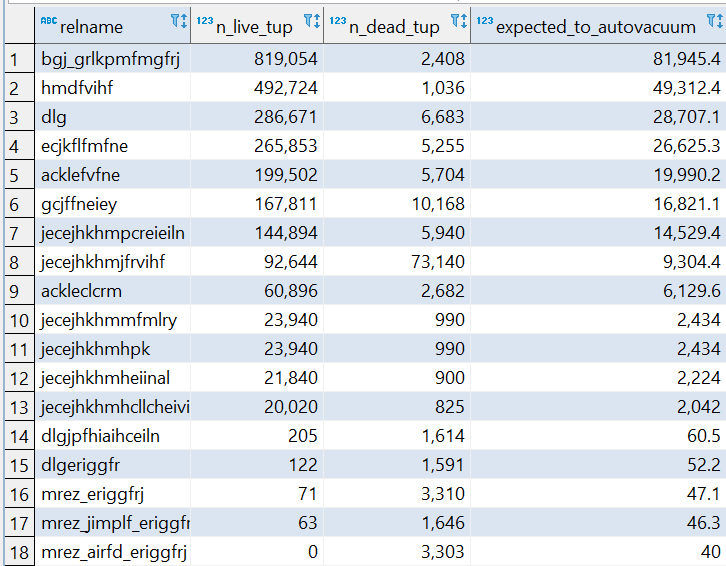 of live tuples as show below picture.select relname,n_live_tup,n_dead_tup,(n_live_tup*.1+40)