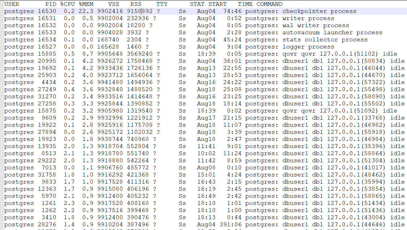 "checkpointer process" is consuming 8.73GB of memory(RSS value as 9158892).