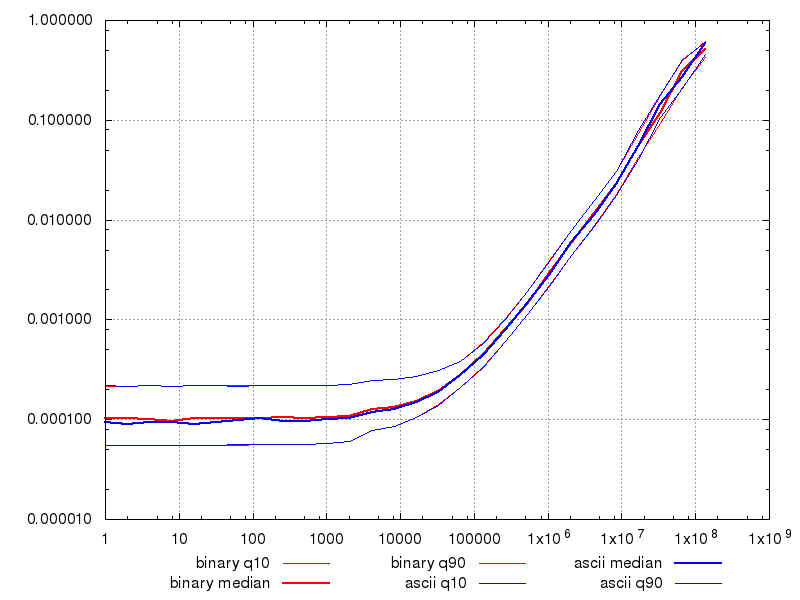 If I used random binary data the test took 250 seconds.binary data is (roughly) five times slower than ascii data?