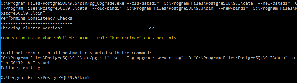 We are Upgrading PostgreSQL under Windows from v9.3 to 9.5. Following steps from https://www.postgresql.org/docs/10/pgupgrade.html