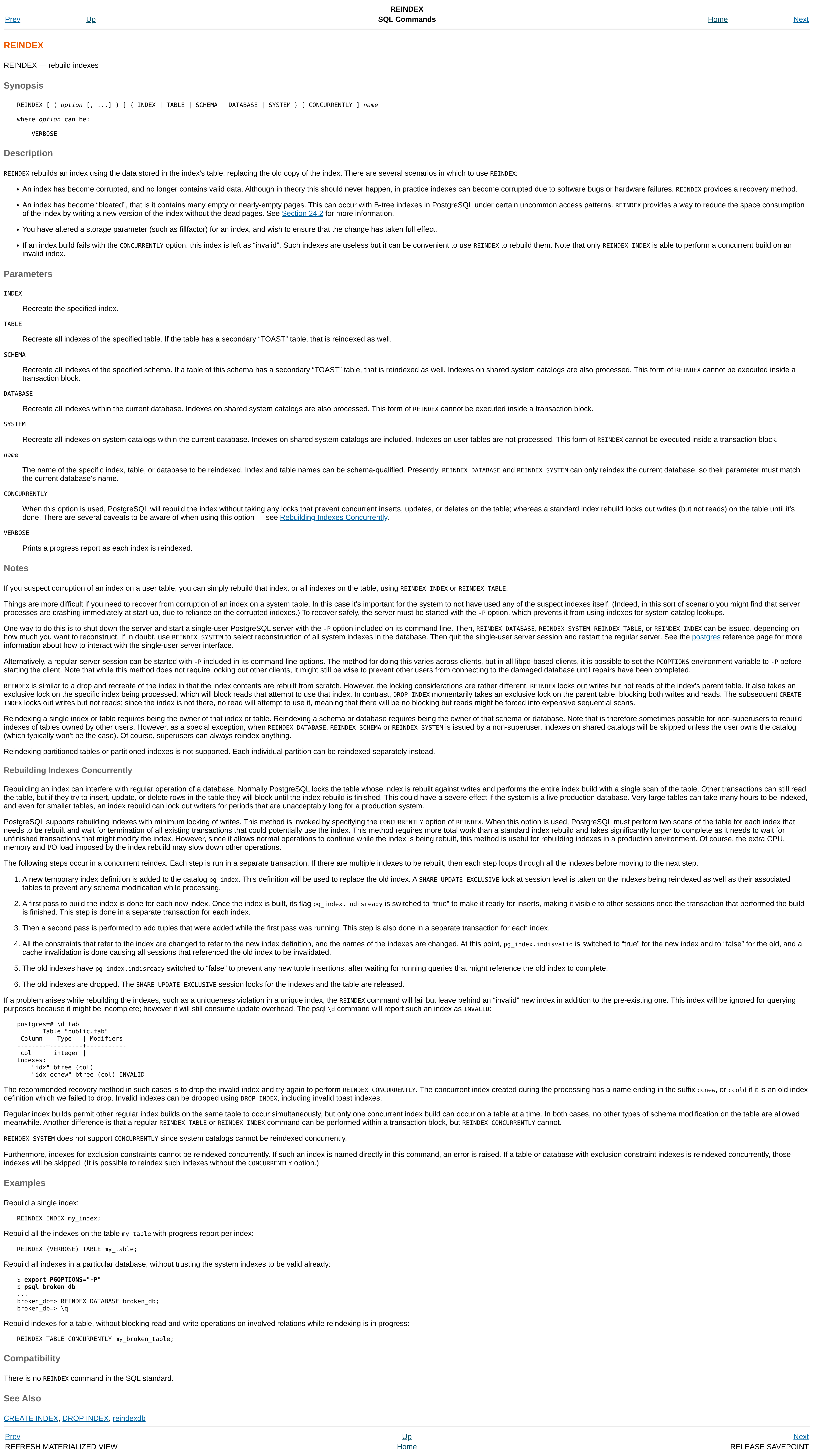 REINDEX [ ( VERBOSE ) ] { INDEX | TABLE | SCHEMA | DATABASE | SYSTEM } name