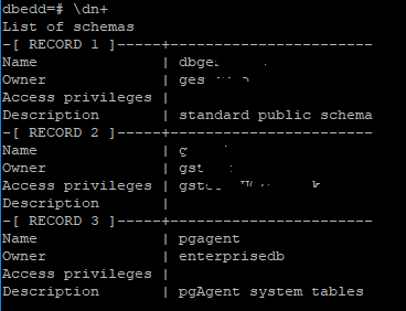 are not visible when I do \dn+ in psql.But when I do SELECT nspname FROM pg_catalog.pg_namespace;, I see the