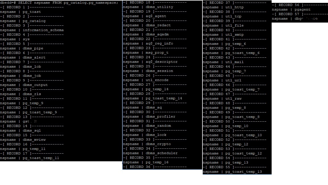 But when I do SELECT nspname FROM pg_catalog.pg_namespace;, I see the