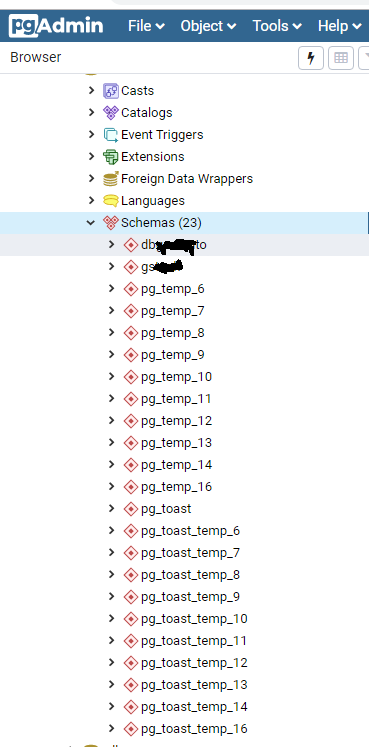 I am using Postgres 11 with Pgadmin4. System schemas pg_temp and pg_toast