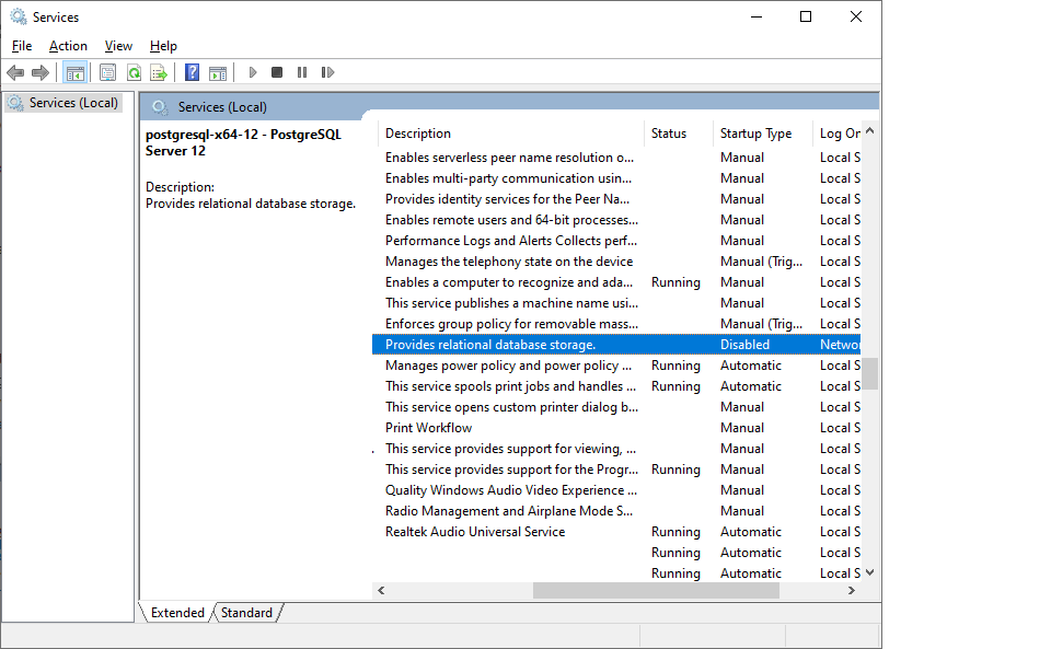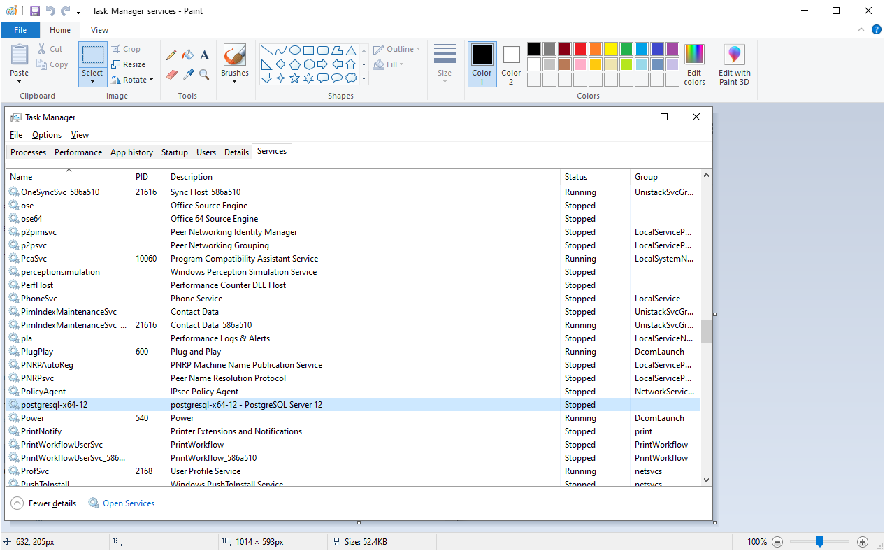 PostgreSQL-x64-12 is list as 'stopped' in the task manger services tab.