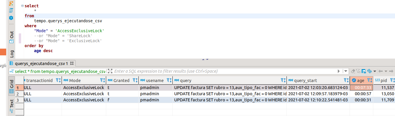 tuple,248043888,248044255,213071,39,NULL,NULL,NULL,NULL,NULL,132/957,21007,AccessExclusiveLock,f,fAs you can see all the AccessExclusive locks are on tuples (rows).