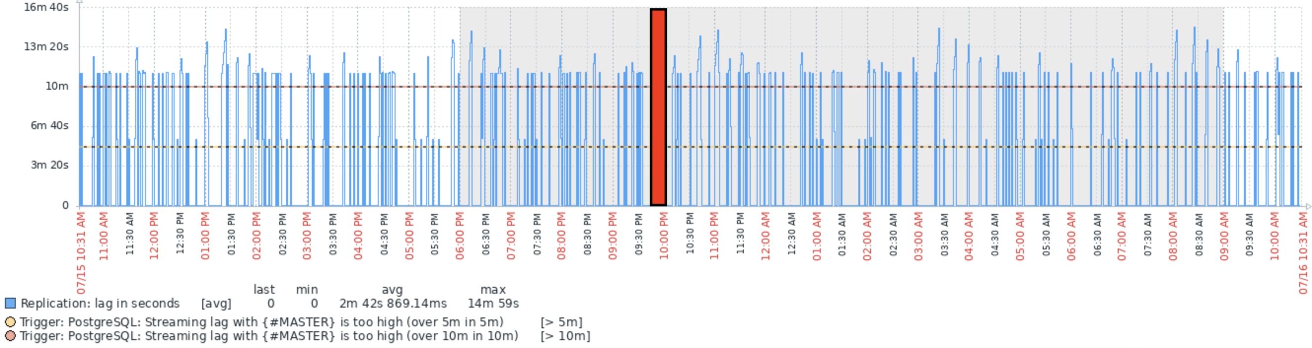 I know that the streaming replication is expected to have delays, but this is getting worse and worse everyday. You can see the replication gap is reaching >10 minutes quite often.