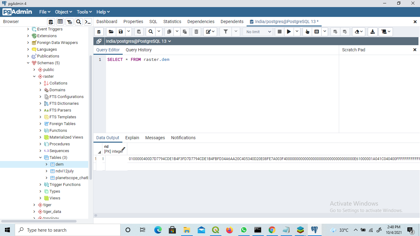 following command to upload the data.raster2pgsql -I -C -s 4326 C:\Users\Admin\Desktop\dem.tif raster.dem |