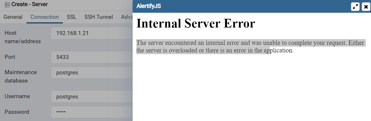 Working fine till yesterday (24.11.2021). When we tried to connect from PGAdmin, it refused to list server list. Thought of some corruption happened, we tried to add a server we got the following error message
