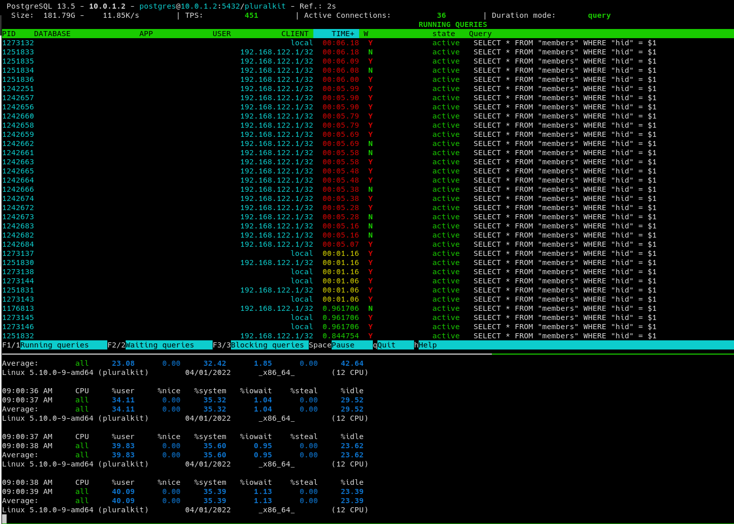 https://paste.sr.ht/blob/9ced99b119c3fce1ecfd71e8554946e7845a44dd )Another thing to look at is `iostat -x -y` and look at disk util %.