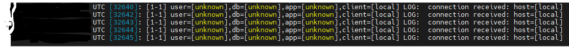 UTC [1436]: [1-1] user=[unknown],db=[unknown],app=[unknown],client=[local] LOG: connection received: host=[local]