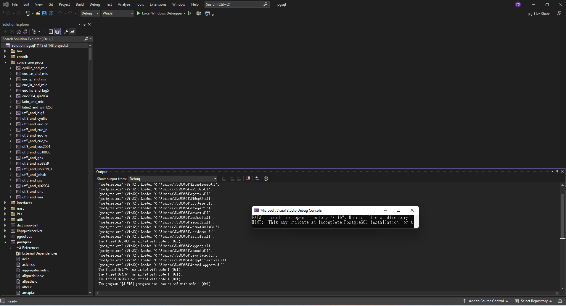 I'm trying to build and debug postgresql on Windows. After building