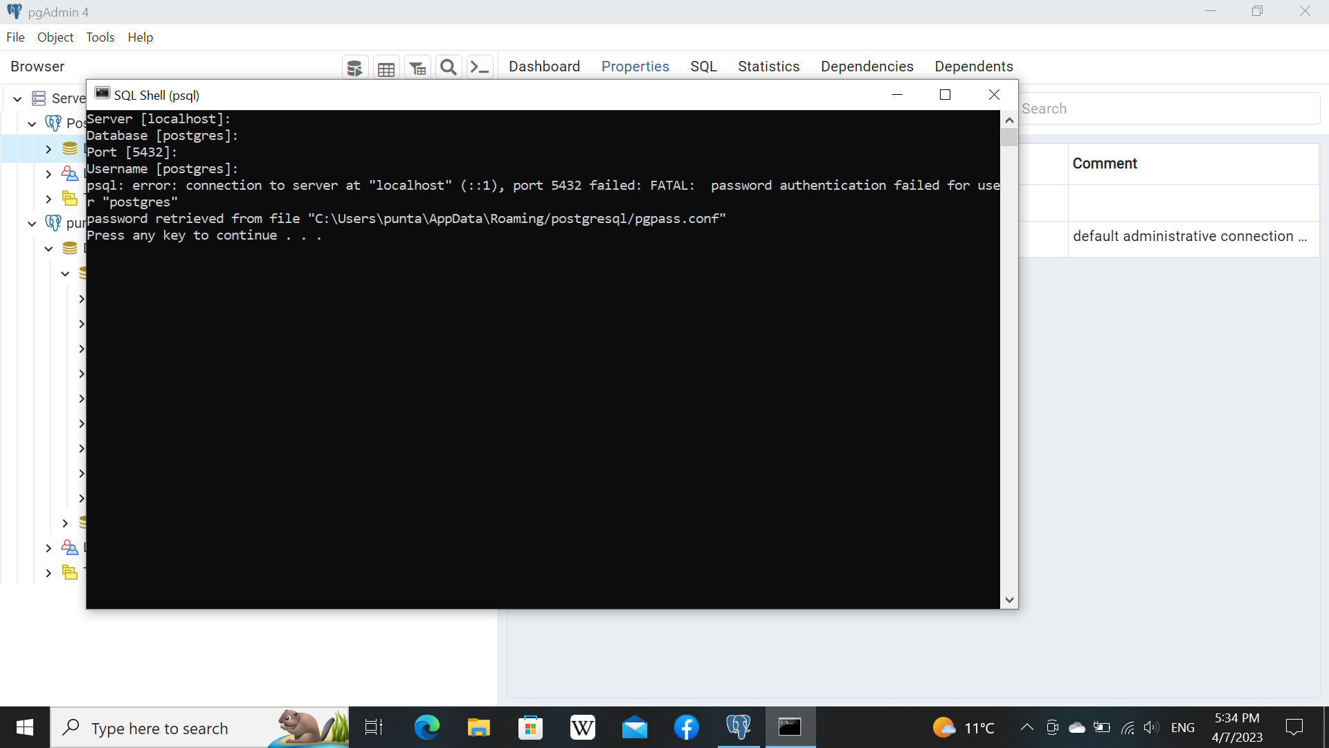 psql: error: connection to server at "localhost" (::1), port 5432 failed: FATAL: password authentication failed for user "punta" Press any key to continue . .