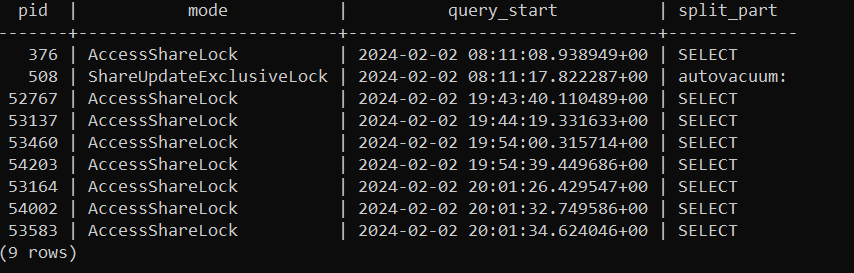SELECT pg.query_start, now() - query_start AS duration, pg.pid pg_pid, pg.state, pg.wait_event, backend_type ,pg.wait_event_type, pg_blocking_pids(pid) as blocked_by,SPLIT_PART(trim(pg.query),' ', 1)FROM pg_stat_activity pg order by now() - query_start desc; query_start | duration | pg_pid | state | wait_event | backend_type | wait_event_type | blocked_by | split_part----------------------------------------------+----------------------------+-----------+--------+------------------------------+--------------------------------------+-----------------------+------------+------------ | | 249 | | AutoVacuumMain | autovacuum launcher | Activity | {} | | | 252 | | LogicalLauncherMain | logical replication launcher | Activity | {} | | | 247 | | BgWriterMain | background writer | Activity | {} | | | 250 | | ArchiverMain | archiver | Activity | {} | | | 246 | | CheckpointWriteDelay | checkpointer | Timeout | {} | | | 248 | | WalWriterMain | walwriter | Activity | {} | 2024-01-27 23:10:54.159577+00 | 3 days 18:55:48. | 271039 | active| BufferPin | client backend | BufferPin | {} | vacuum 2024-01-30 21:33:50.262265+00 | 20:32:52.490309 | 558810 | idle | ClientRead | client backend | Client | {} | SELECT 2024-01-31 16:53:17.695929+00 | 01:13:25.056645 | 641053 | idle | ClientRead | client backend | Client | {} | SELECT 2024-01-31 18:04:48.929097+00 | 00:01:53.823477 | 645812 | active | | client backend | | {} | SELECT 2024-01-31 18:05:02.221272+00 | 00:01:40.531302 | 645814 | active | | client backend | | {} | SELECT 2024-01-31 18:05:04.927131+00 | 00:01:37.825443 | 645925 | active | | client backend | | {} | SELECT 2024-01-31 18:05:12.088875+00 | 00:01:30.663699 | 645109 | active | | client backend | | {} | SELECT 2024-01-31 18:05:30.202305+00 | 00:01:12.550269 | 645695 | active | | client backend | | {} | SELECT 2024-01-31 18:05:47.872601+00 | 00:00:54.879973 | 645924 | active | | client backend | | {} | SELECT 2024-01-31 18:06:16.425286+00 | 00:00:26.327288 | 645593 | active | | client backend | | {} | SELECT 2024-01-31 18:06:18.286905+00 | 00:00:24.465669 | 646174 | idle | ClientRead | client backend | Client | {} | select 2024-01-31 18:06:24.878488+00 | 00:00:17.874086 | 644993 | active | | client backend | | {} | SELECT