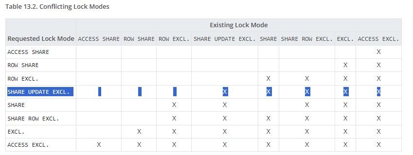 - SHARE UPDATE EXCLUSIVE (ShareUpdateExclusiveLock)