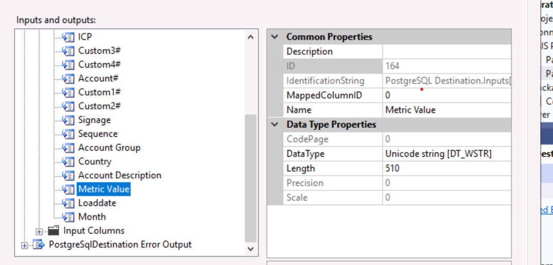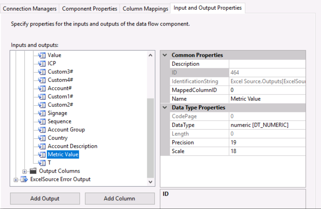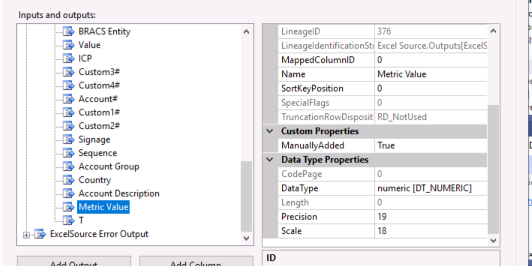 get the data in. Getting errors relating to destination column size.[Excel Source [24]] Error: System.Exception: SqlTruncateException: Numeric arithmetic causes truncation.. RowNumber=1, ColumnName=Metric Value [DataType=DT_NUMERIC,Length=0], Data=[Length=12, Value=311116655.63]