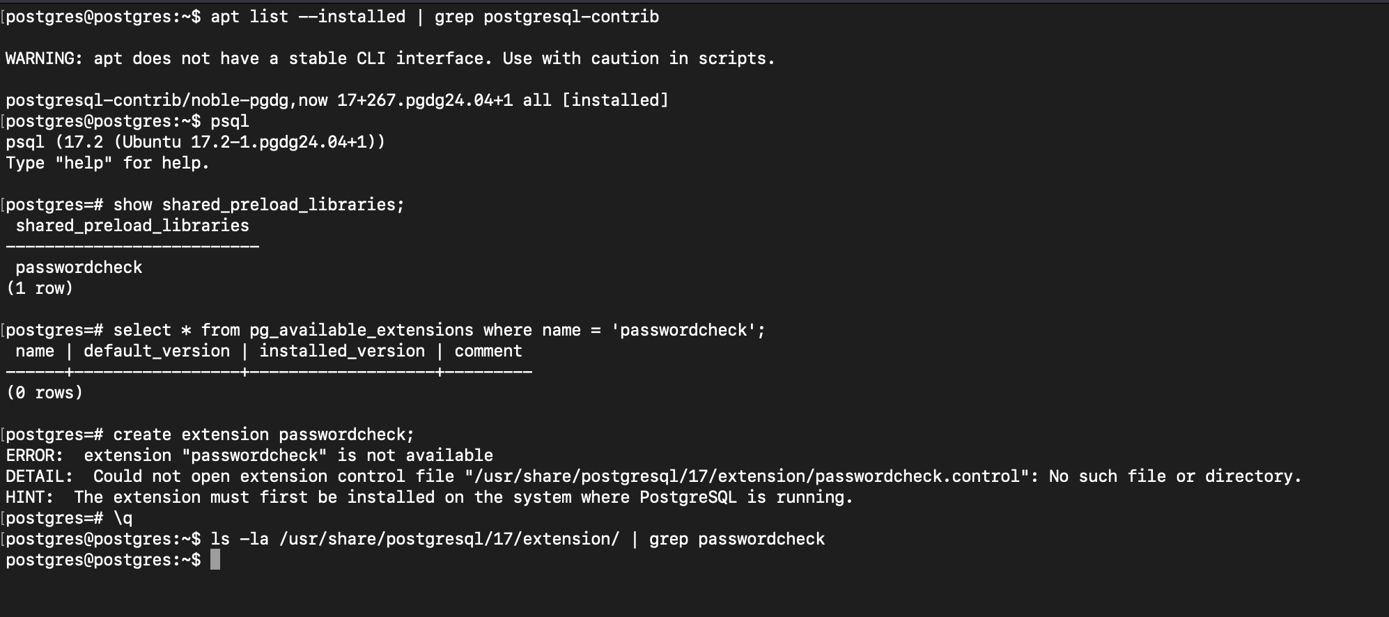 "/usr/share/postgresql/17/extension/passwordcheck.control": No such fileor