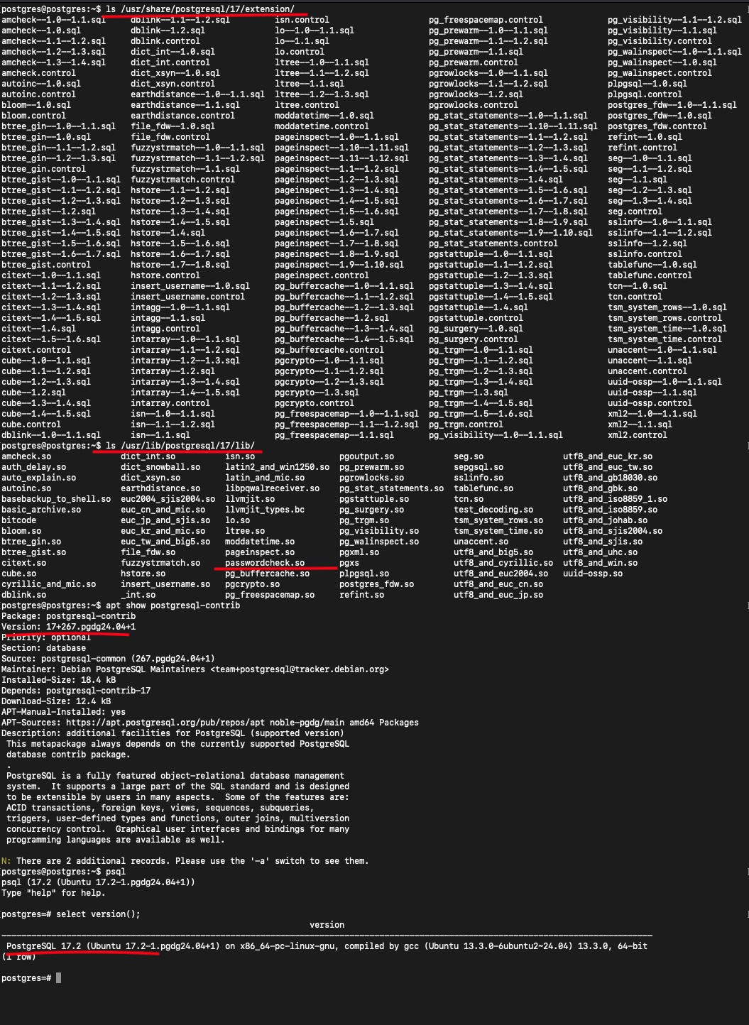 *"/usr/lib/postgresql/17/lib/"* directory. It seems that, for some reason,