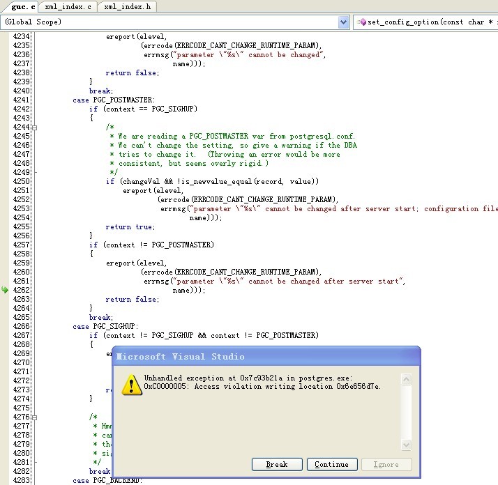 and quickly goes to line 4262 of backend/utils/misc/guc.c