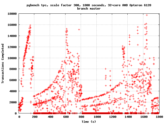 Just for kicks, I ran two 30-minute pgbench tests at scale factor 300
