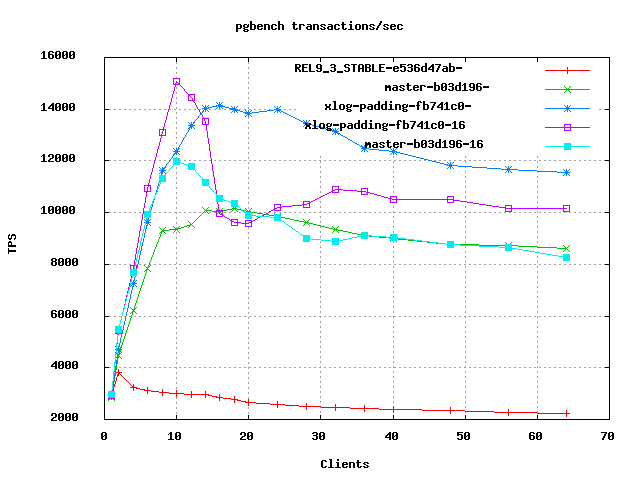 The "master-b03d196" is unpatched git master, "xlog-padding-fb741c0" is