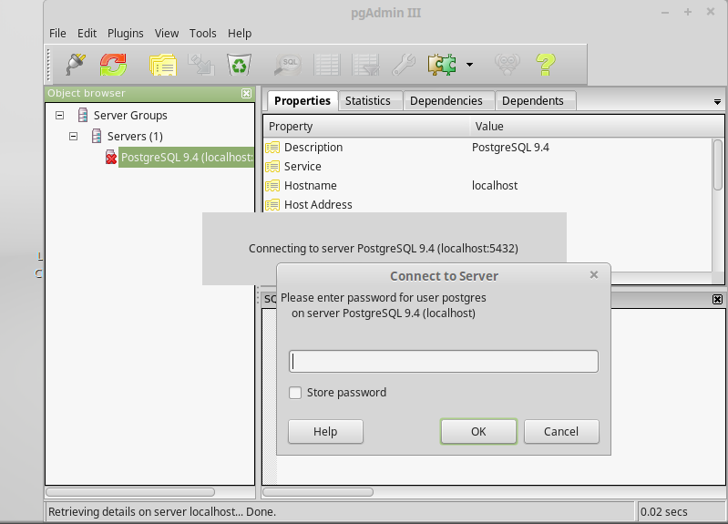I'm using postgresql 9.4 with pgadmin III on Linux Mint 17.2 32bit...