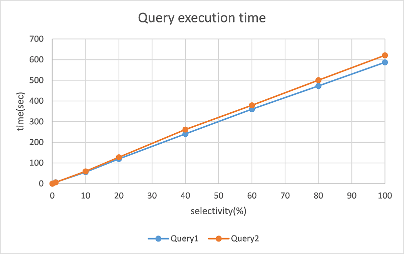 We show the execution time of two queries as Figure 1. In this case, the selectivity is proportional to KEY, and become 100% when KEY=10000.