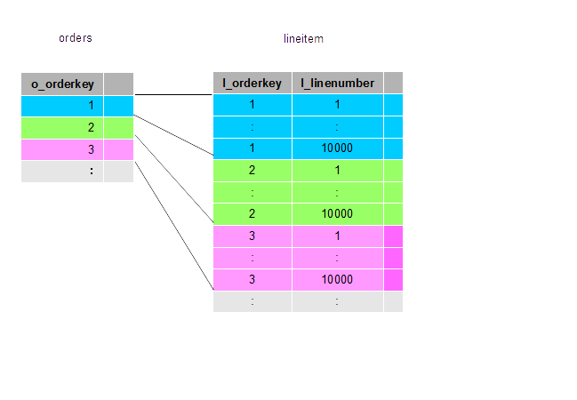 Let me explain more detail why these two workloads are nearly identical. Lineitem has a clustered index on l_orderkey column, and in Query1, this index is used on scanning lineitem, so I/O workload is sequencial scan of lineitem. In Query2, this index is also used on scanning inner table (i.e. lineitem) repeatedly on nested loop join. And outer table (i.e. orders) is scanned by the index on o_orderkey, so the key of inner scan is ordered by l_orderkey. That is to say, lineitem is substantially scanned from head (Figure 2).