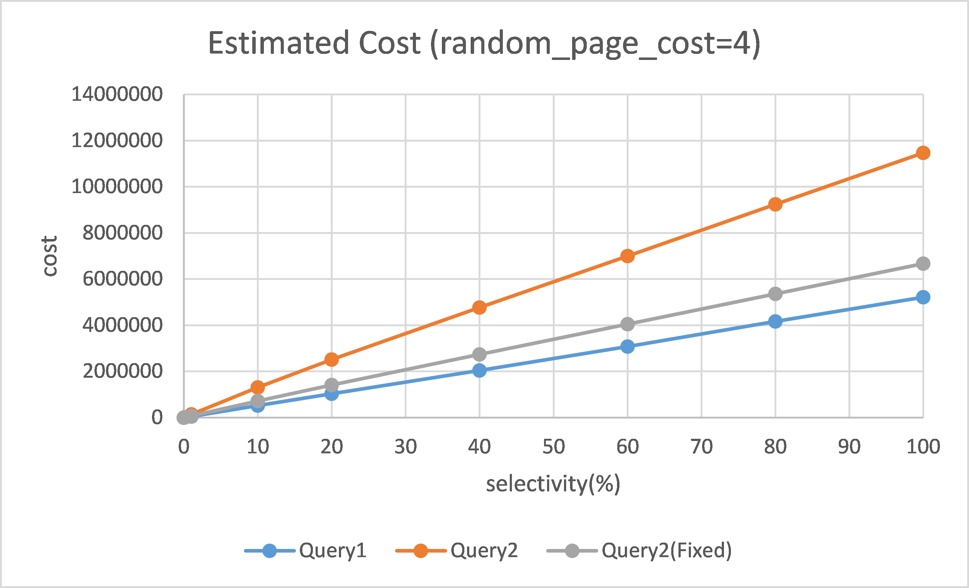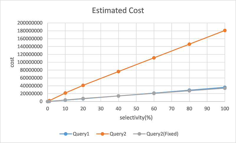 As this result shows, the difference between Query1 and Query2(Fixed) is smaller than original one, so the cost estimation seems to be improved.