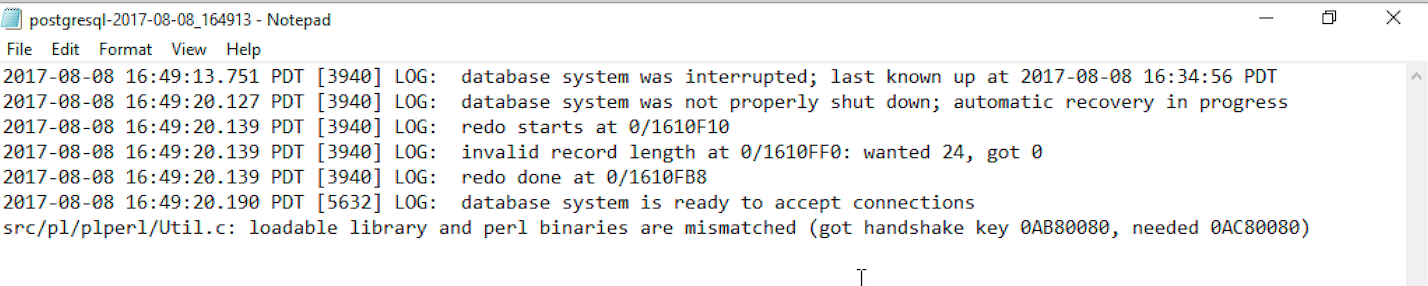 Attach is the screenshot of the contents of the postmaster log that was