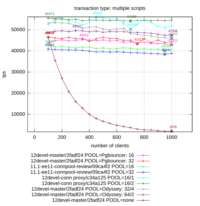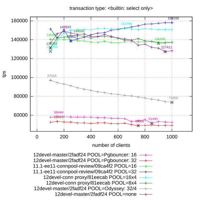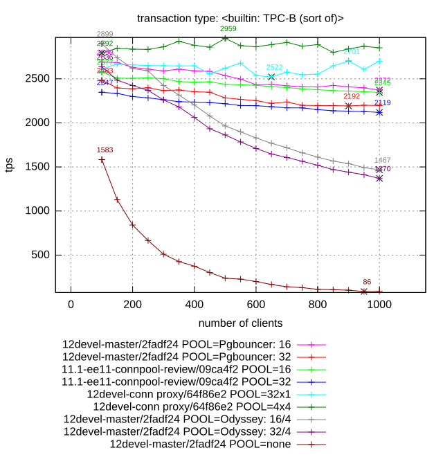 Client (pgbench), pooler and postgres are laucnhed at the same host.