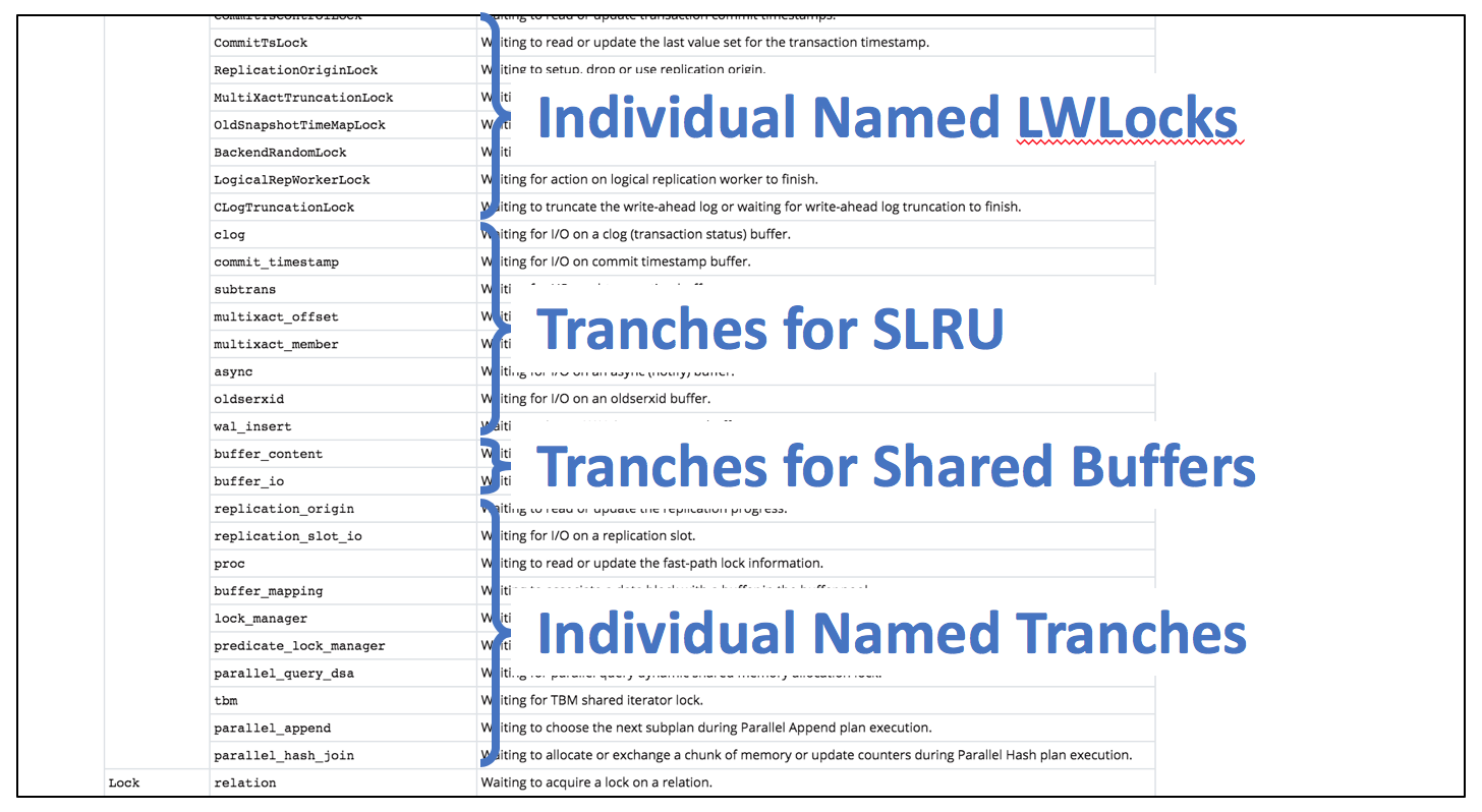 https://www.postgresql.org/docs/current/monitoring-stats.html#WAIT-EVENT-TABLE