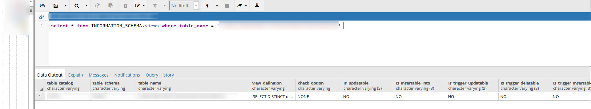ON SELECT TO my_view DO INSTEAD SELECT DISTINCT d.name AS p...We assumed it was the create rule but also looked at "REPLICA ID" and couldn't find anything on the properties that it had such a property ... we used the query from here: https://stackoverflow.com/questions/55249431/find-replica-identity-for-a-postgres-table