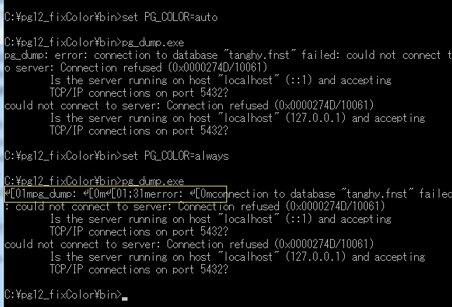 said.Before PG_COLOR=auto is set: pg_dump: error: connection to database