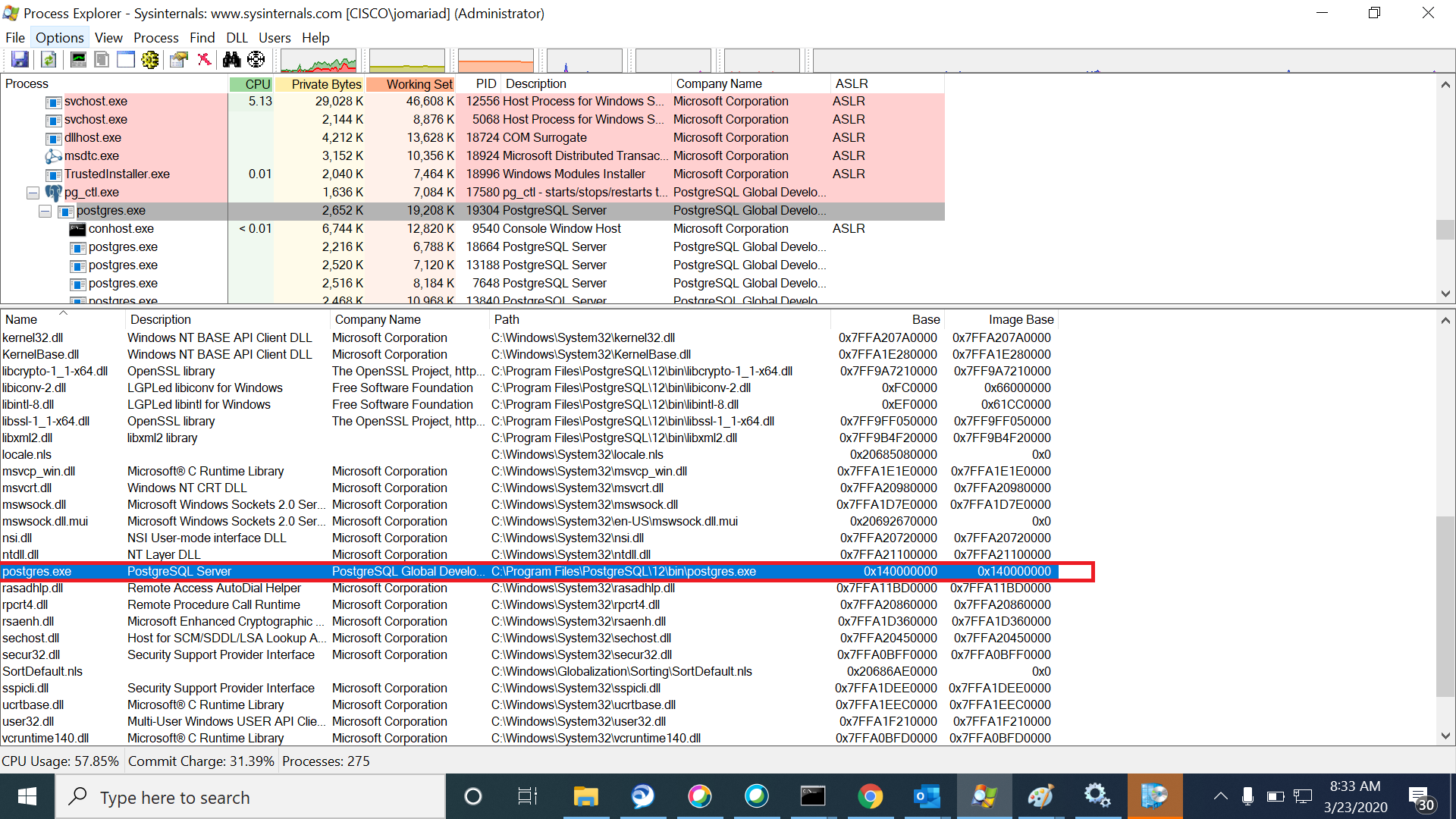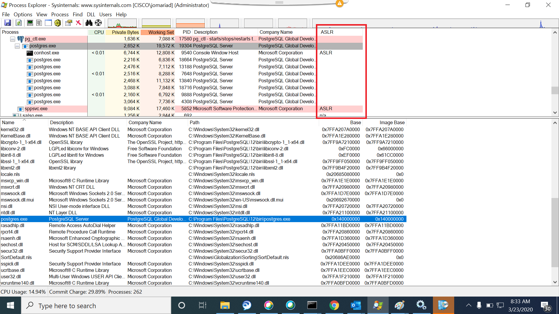 The base addresses of postgres in Process Explorer doesn't change upon restart (Postgres_Imagebase.png).