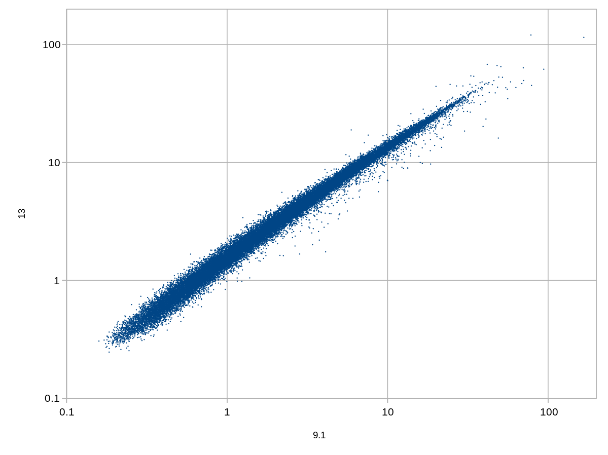 This plots durations of all 33k queries, comparing duration on 9.1