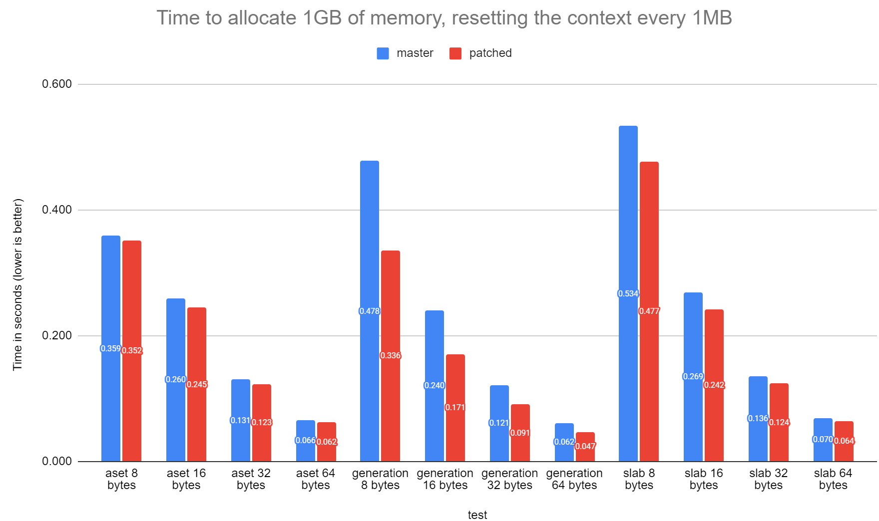generation.c and slab.c.See the attached patch which runs the same test as in [1] (aset.c is