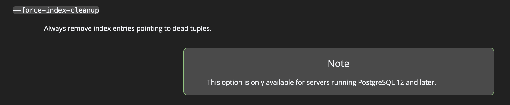 In the postgres document we notice that the --force-index-cleanup option is available in PostgreSQL server 12 and Later. We have postgres db running on 12.9 but we don’t see this option.