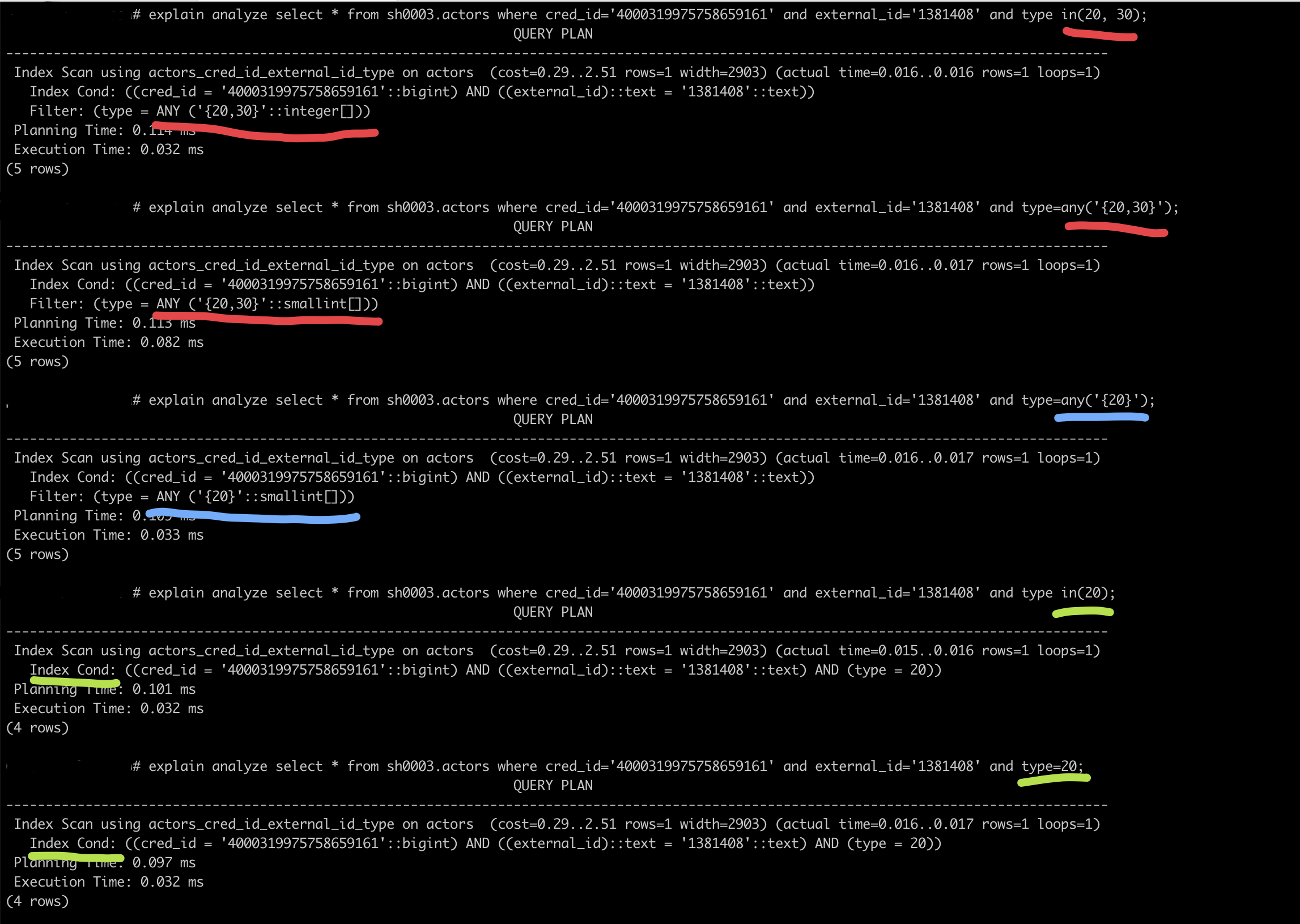 the plan, whilst =ANY() always remains =ANY(). This causes PG to choose a