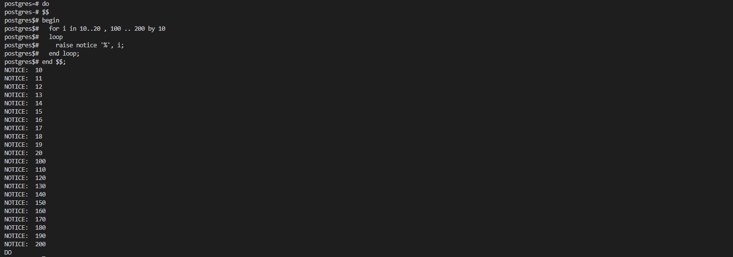 odyssey=> do $$ declare i int; begin for i in select generate_series (10,