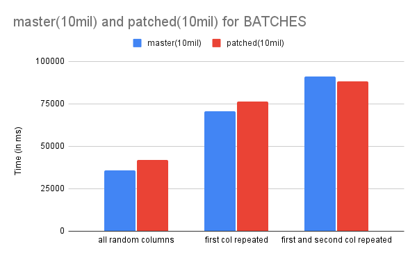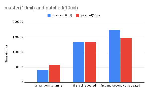 Tested on WORK_MEM=3 GB for 1 and 10 Million rows data.