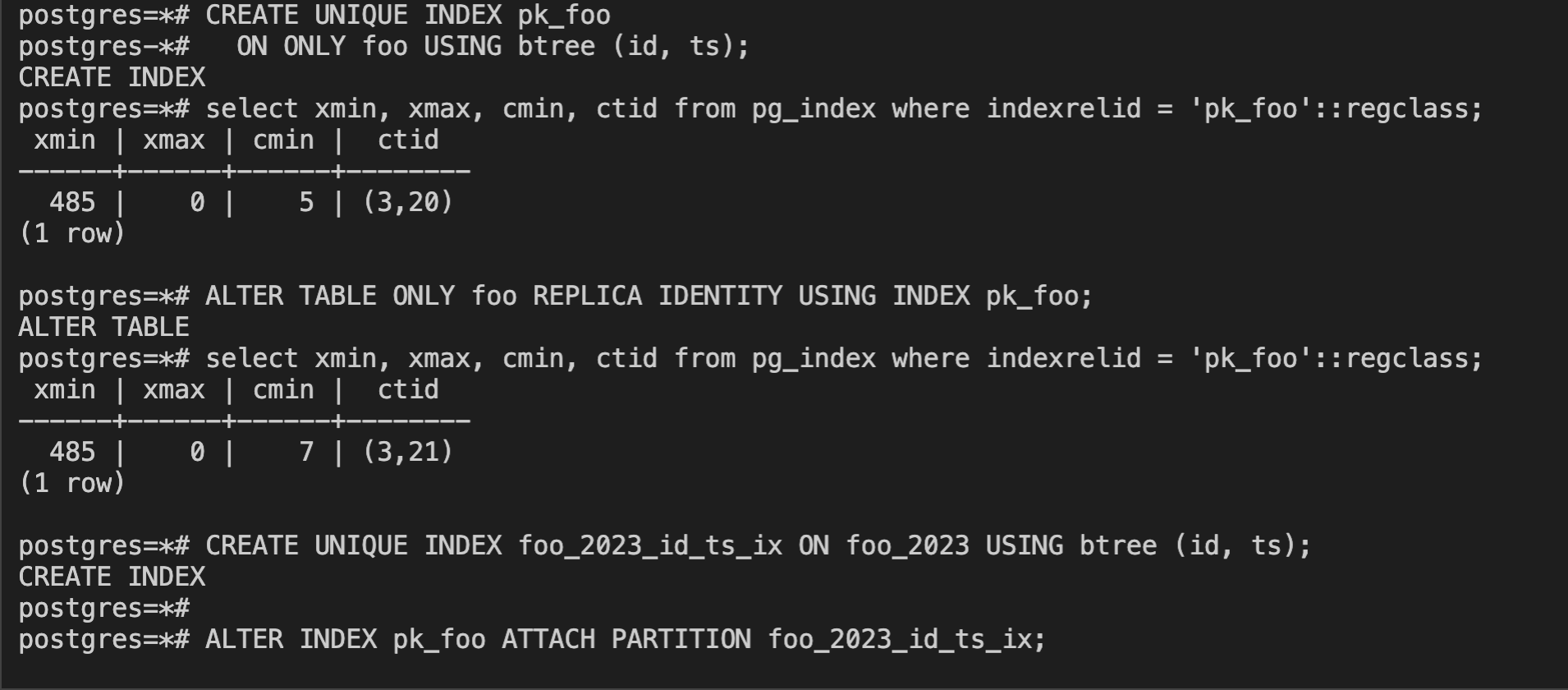 The 'ALTER INDEX pk_foo ATTACH PARTITION foo_2023_id_ts_ix' returns