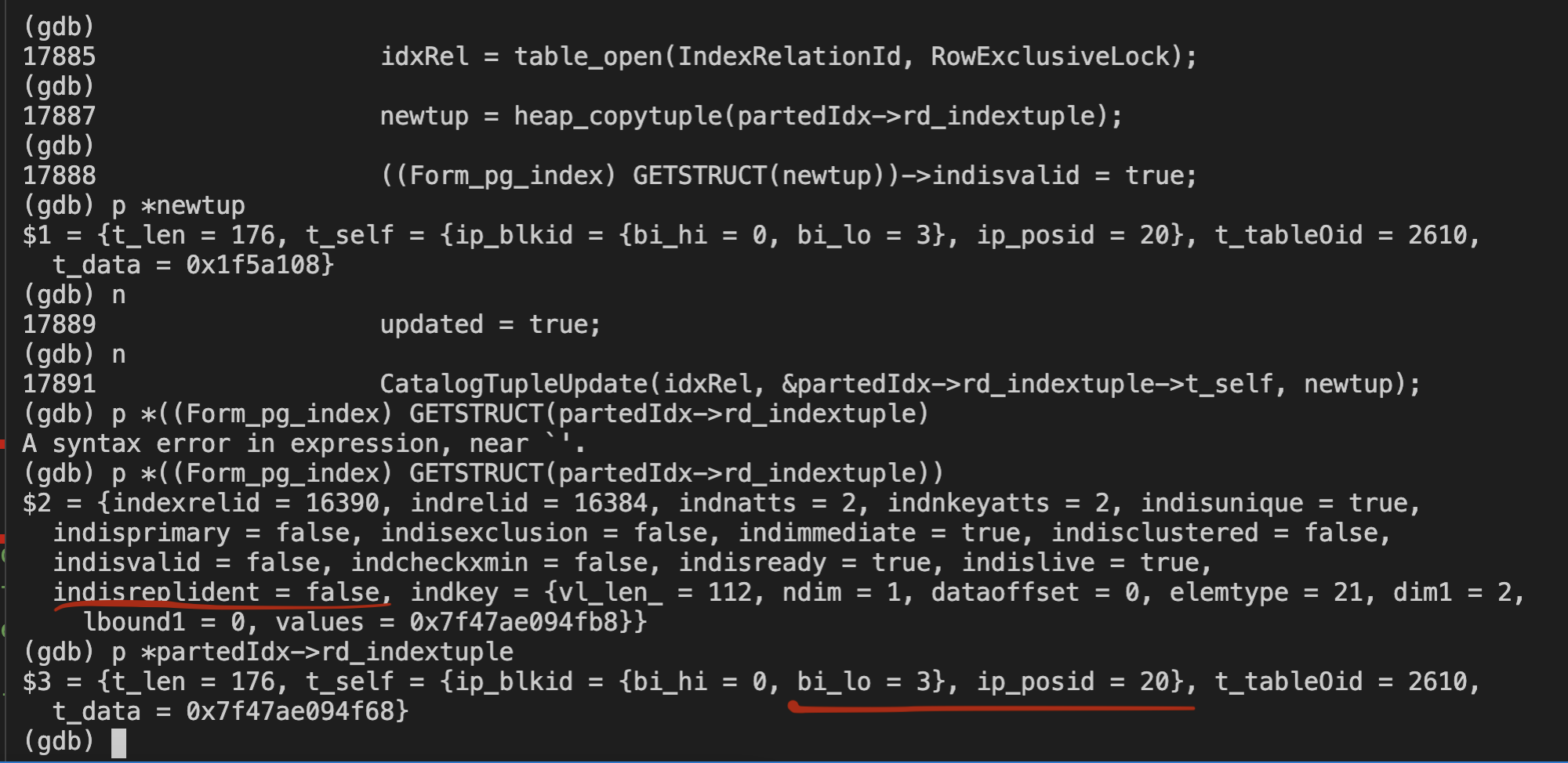 The 'indisreplident' is false, the ctid field value is old and it does