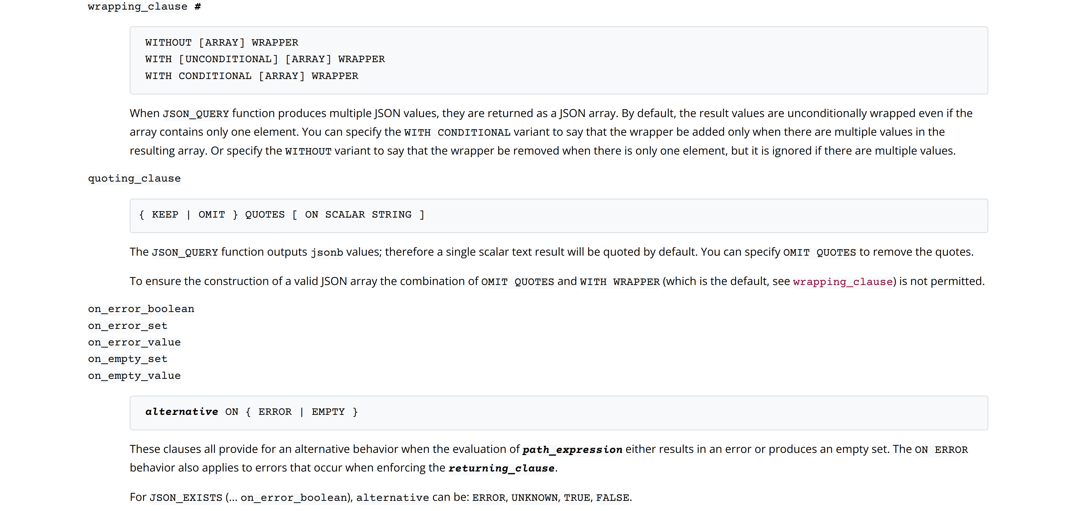 {{For JSON_EXISTS (... on_error_boolean), alternative can be: ERROR,